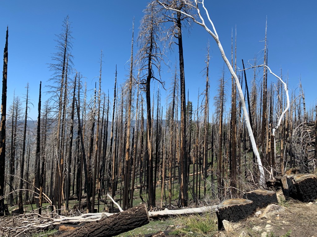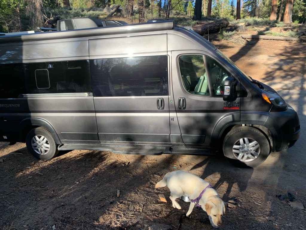Public lands. When we talk about dispersed camping on public lands, we do not mean national parks. If a national park allows backcountry camping — and many do not — it is tent only. The public lands most hospitable to parking your rig overnight are woods and fields operated by the US Forest Service and Bureau of Land Management. The difference between the two organizations is a little confusing since many of the kinds of land they oversee overlap, but suffice to say both are under federal jurisdiction and are supported by your tax dollars. Although there are scattered sites around the Midwest and East Coast, most USFS and BLM land hospitable to overnight free camping are in the West. USFS or BLM camping is often found on secondary roads, and include remote sites in the woods or on a field, or perhaps by the side of the road. There are no amenities. No picnic tables. No fire pits. No toilets. A 14-day stay is usually the maximum allowed. Our favorite stay was a wooded site deep in the Sequoia National Forest that we found by driving on a rural road in search of the Trail of 100 Giants, a grove of the massive trees.